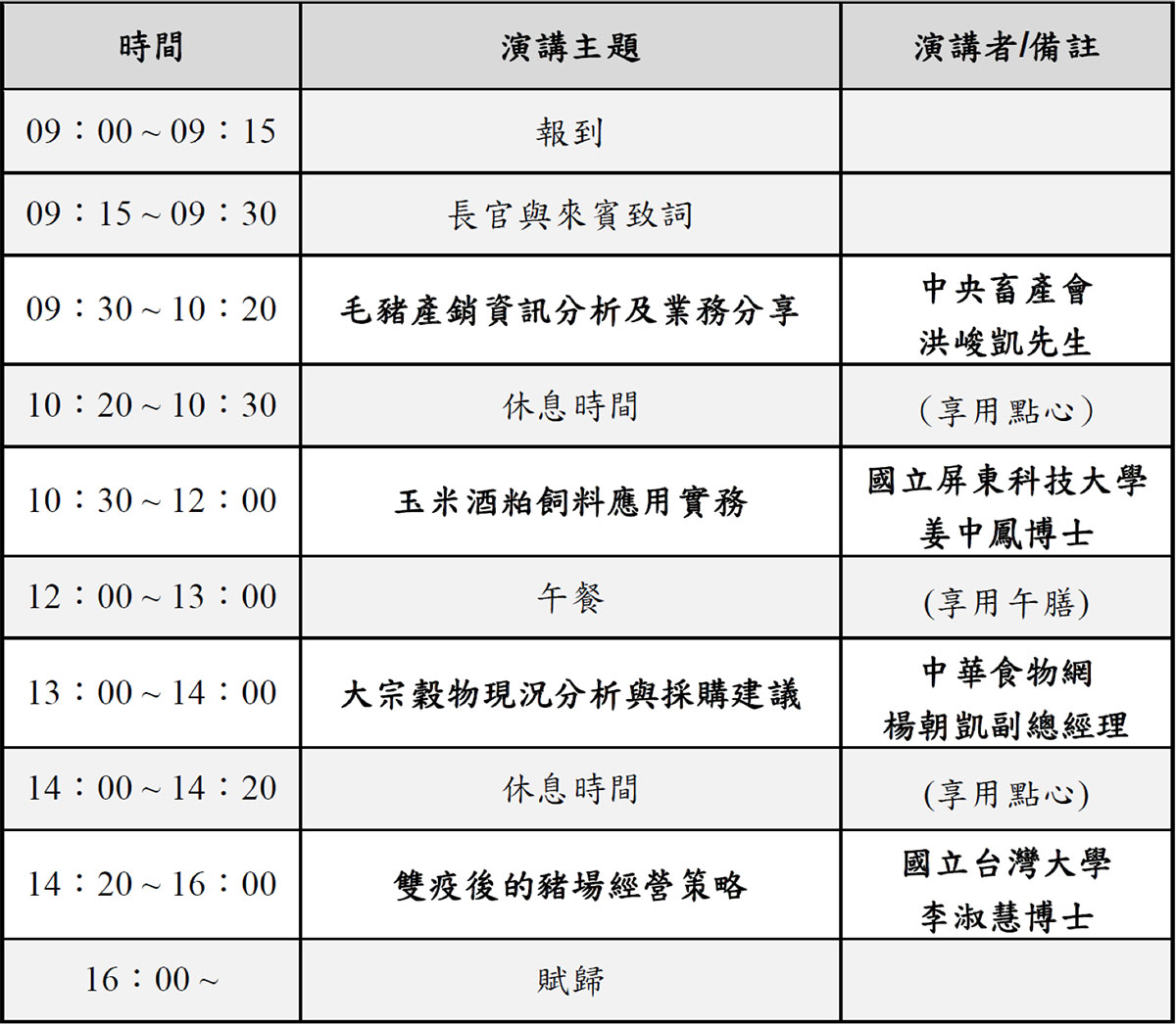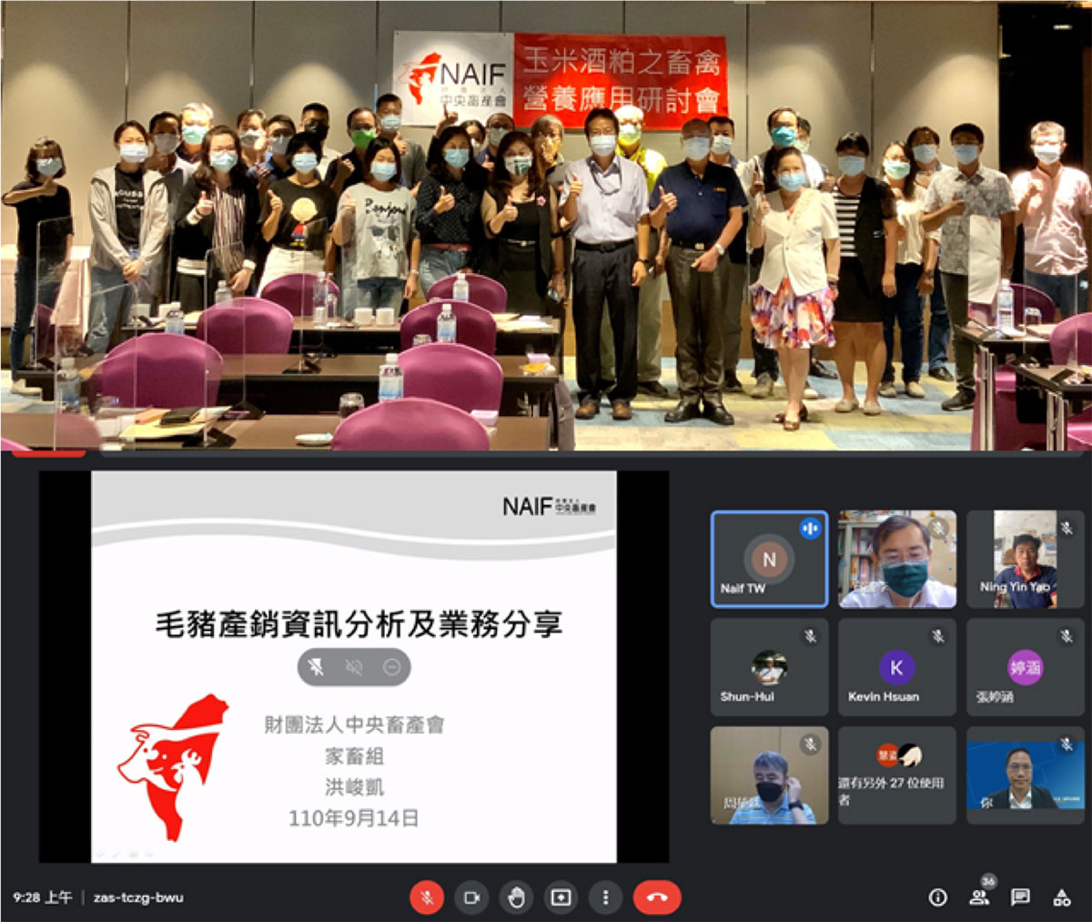 美國穀物協會與中央畜產會於2021年9月14日在嘉義縣的長榮文苑酒店聯合舉辦了【玉米酒粕之畜禽營養應用暨養豬及飼料穀物產銷資訊研討會】。為遵循中央疫情指揮中心的防疫規定,現場僅限30名人員參加,另外同步有40名在線上的與會,以虛實結合的模式舉辦此研討會。與會者有飼料生產者、動物飼料營養學家、養豬戶、政府農業官員、以及動物系所的教授及研究人員。本次研討會特別邀請了4位專家學者進行以下議題: