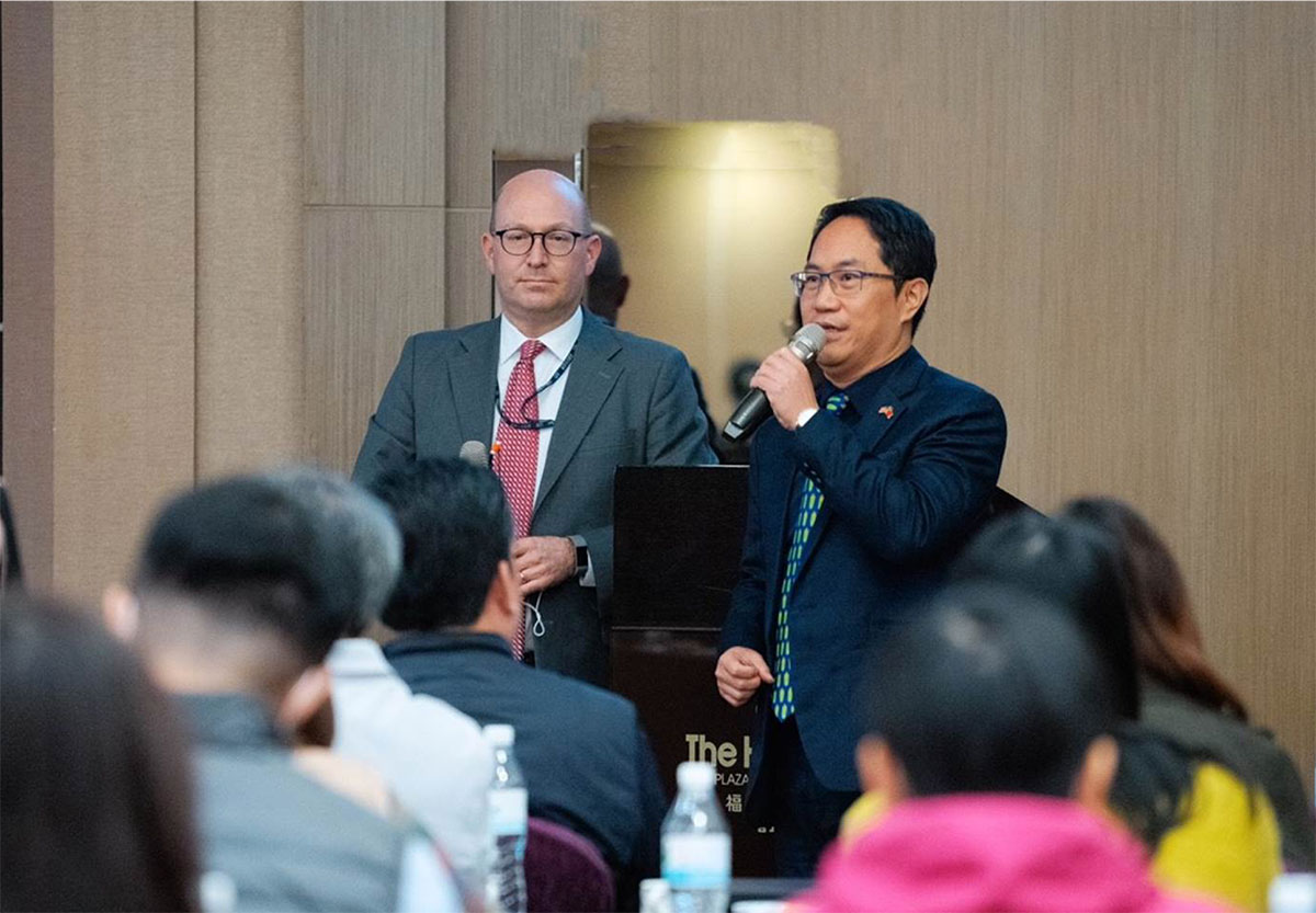 【美國在台協會農業組長 彭禮先生Mr. Mark Petry致詞,主持人美國穀物協會駐台代表 盧智卿翻譯】