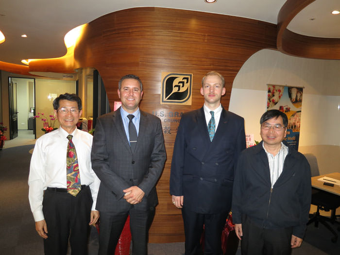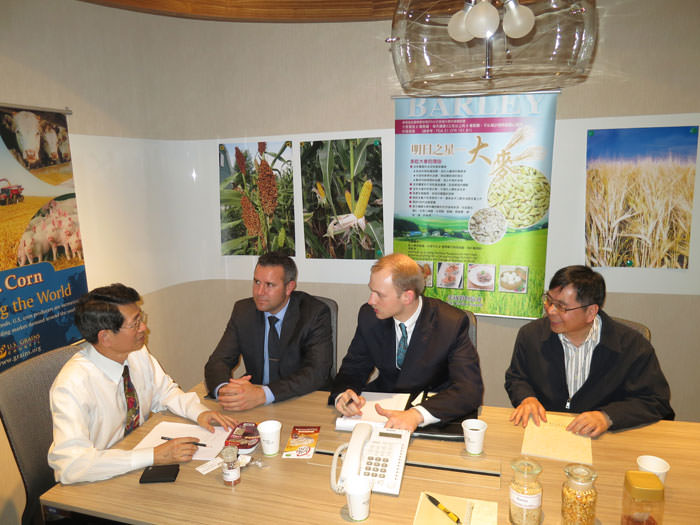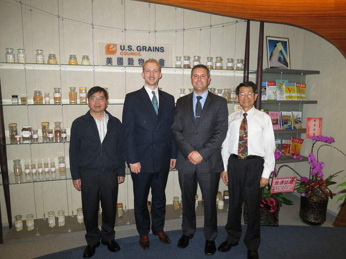 美國Consolidated Grain & Barge Inc. (CGB) 貨櫃業務發展部門Mr. Calvin Koeller,貨櫃與飼料原料銷售經理 Mr. Lucas Blaustein,與其台灣代理商匯記有限公司許東茂經理於3月16日訪問美國穀物協會台灣辦事處,討論穀物與飼料原料進口與市場現況。 3月16日訪問美國穀物協會台灣辦事處,圖右起,匯記有限公司許東茂經理,Mr. Lucas Blaustein,Mr. Calvin Koeller和美國穀物協會張學義代表。