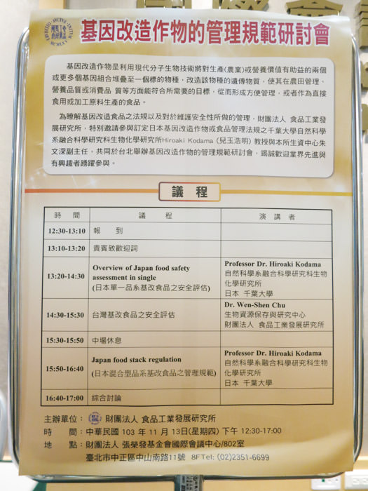為瞭解基因改造食品之法規以及對於維護其安全性所做的管理,美國穀物協會與財團法人食品工業發展研究所特別邀請參與訂定日本基因改造作物或食品管理法規之千葉大學自然科學系融合科学研究科生物化學研究所Hiroaki Kodama(兒玉浩明)教授與財團法人食品工業發展研究所生資中心朱文深副主任,共同於台北張榮發基金會國際會議中心舉辦基因改造作物的管理規範研討會。