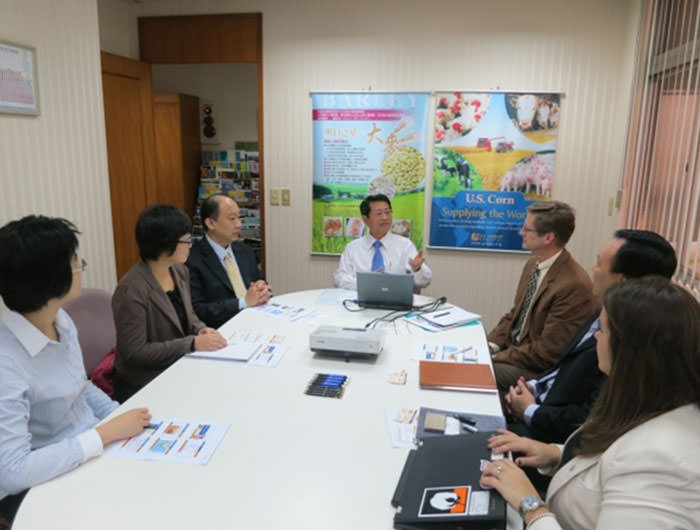 美國黃豆出口協會駐台代表湯紹聯先生亦參與此一聚會。當天張學義駐台代表以簡報介紹穀物最新的市場情況和該協會的推廣工作,湯代表亦介紹該協會的推廣工作,接著討論生物科技產品在我國的申請與核准現況。Mr. Kohne 則介紹拜耳作物科學股份有限公司的新產品研發現況,以及GEMAA和Accord的觀念與進展。