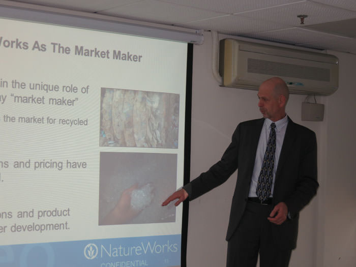 美國廠商以玉米為原料,製成玉米澱粉,將玉米澱粉發酵成乳酸,將乳酸聚合為聚乳酸(Polylactic Acid簡稱為PLA) ,以做成生物可分解材料,目前已量產。生物可分解材料在整個產品的生命循環過程中,無論在生產與廢棄物處理均較傳統塑膠對環境產生較少的毒性,所以生物可分解材料較傳統塑膠更符合生態環境的效益。美國PLA製造廠商NatureWorks公司的業務處長Mr. Steve Davies,亞太業務發展顧問孫孝慧和美國穀物協會駐台代表張學義於3月17日拜訪行政院環境保護署資源回收管理基金管理委員會,與李守謙組長,第3組副組長費齊信,助理環境技術師張紹欣及聘用助理環境技術師林高正討論相關管理事宜。據稱Nature Works公司有意於我國建立一套使用過之聚乳酸包材之收集與再利用系統。