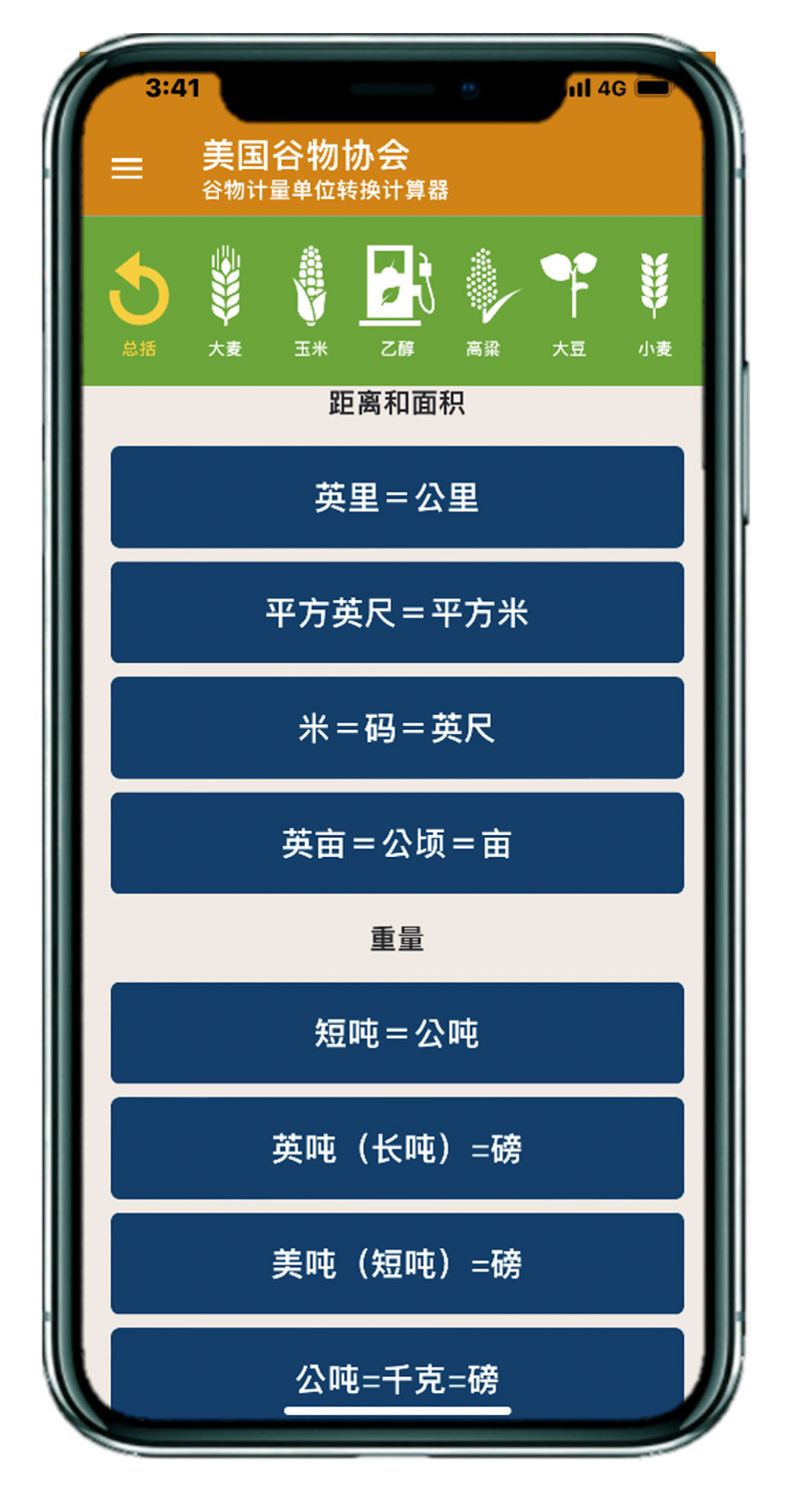 該應用程式—稱為【美國穀物協會 穀物計量單位轉換計算器】—提供美國大麥、玉米、高粱、大豆、小麥等產品的轉換,還包括玉米乾酒粕(DDGS)和乙醇。該應用程式還提供其他相關度量的換算,包括距離、面積、和溫度。