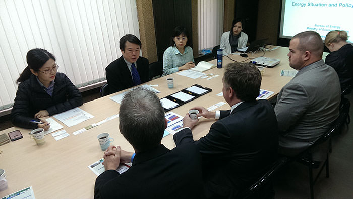 12月14日拜訪經濟部能源局,面對鏡頭圖左起,工業技術研究院黃小玲管理師,經濟部能源局能源技術組蘇金勝組長,林淑芳研究員,和工研院馮玉婷。