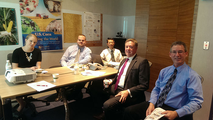 12月14日在美國穀物協會台灣辦事處討論市場現況,圖左起,燃料酒精出口專案經理鞏希麗小姐,密蘇里州玉米協會的夏博禮先生,張學義駐台代表,美國總部首席經濟分析師杜邁克先生,內布拉加州玉米協會的貝羅吉先生。