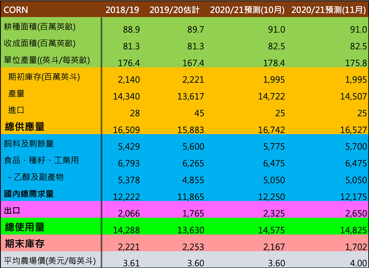 美國農業部最新供需報告,2020/21年美國玉米的單位面積產量下調至每英畝175.8英斗,使得總產量減少2.15億英斗為145.07億英斗;因產量減少預期價格將上漲,故降低飼料和剩餘用量7500英斗為57億英斗;玉米出口量則增加3.25億英斗為26.50億英斗,為歷史新高的出口量。整體而言,供應量下降而使用量增加,2020/21年玉米庫存調低4.65億英斗至17.02億英斗,此數字是2013/14年以來的最低。玉米平均農場價格上漲40美分至4.00美元。