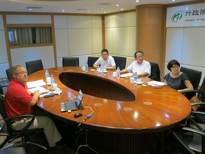 於7月10日參訪行政院農業委員會,由黃金城副主任委員(右2)、陳希嘉 技正(右1)與塗建銘技士(右3)接待。