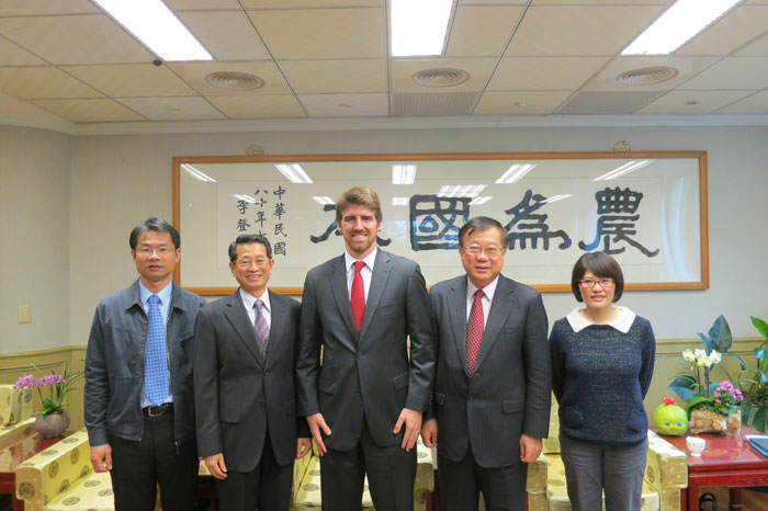 3月2日拜會行政院農業委員會,圖右起,畜牧處陳希嘉技正,陳保基主任委員,康安儒先生,美國穀物協會張學義代表,和陳志成技士。
