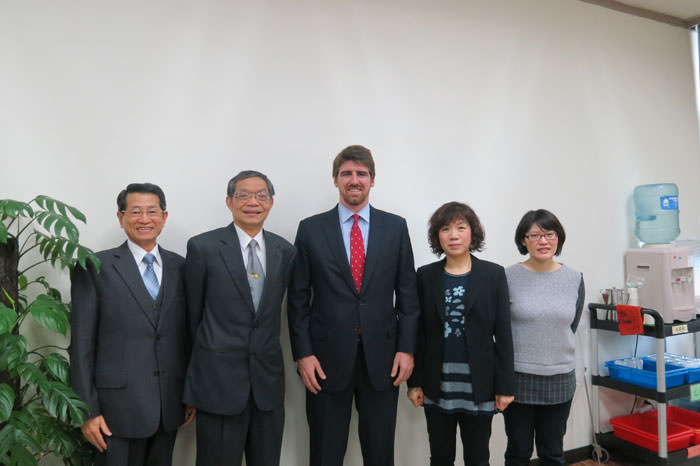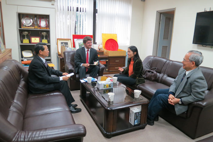 3月2日拜訪國立台灣大學。圖左起,微生物與生化學研究所所長潘子明教授,動物科學技術學系主任陳明汝教授,康安儒先生和美國穀物協會張學義代表。