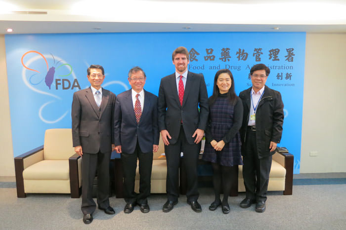 3月3日拜訪行政院衛生福利部食品藥物管理署。圖右起,科技中心林信堂博士,食品組周珮如科長,康安儒先生,潘志寬組長,和美國穀物協會張學義代表。