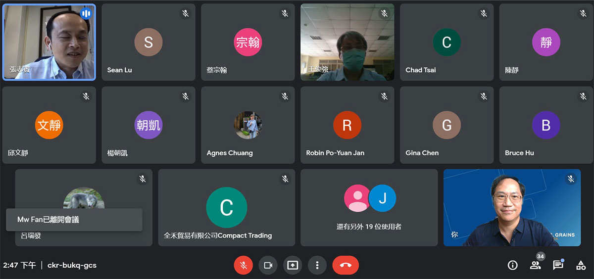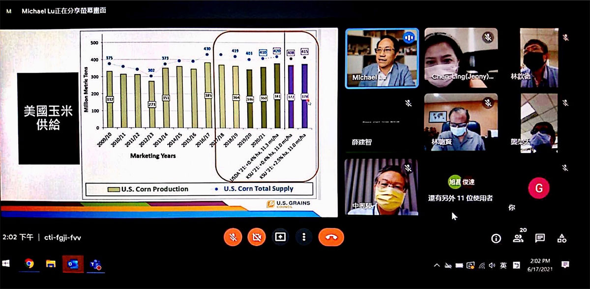 於2021-6-17與中央畜產會林聰賢董事長(前農委會主委)、陳中興執行長、王旭昌副執行長、及其領導幹部共19人進行視訊會議。中央畜產會是經立法通過的財團法人,其中央主管機關為行政院農業委員會,其主要任務是建立產銷調節機制,達到事前預警、穩定產銷之目標,是政府與畜牧產業團體間重要的溝通橋樑,長期以來中央畜產會與美國穀物協會一直維持著緊密的夥伴關係。此次視訊會議,雙方討論了全球玉米市場的前景,以及疫情對台灣家禽/畜牧業的影響,並討論今年下半年的聯合專案合作計畫。