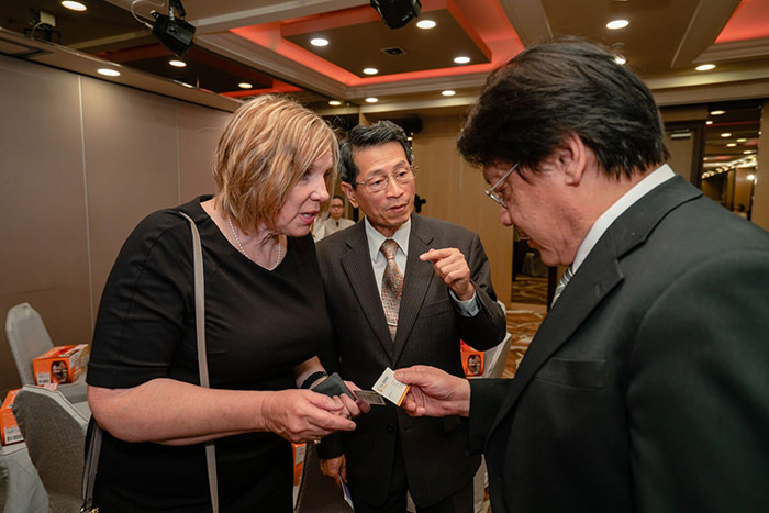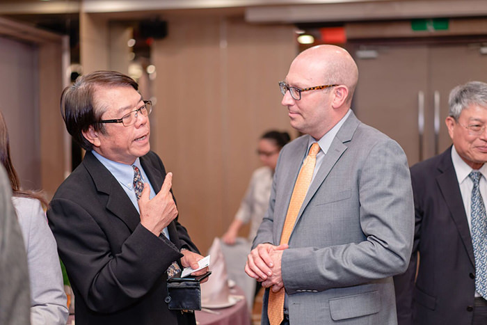 美國在台協會農業貿易中心傅貴先生(Mr. Chris Frederick) 、農業組副組長楊熾先生(Mr. Andrew Anderson-Sprecher)、與新記國際股份有限公司經理滕春輝交談甚歡