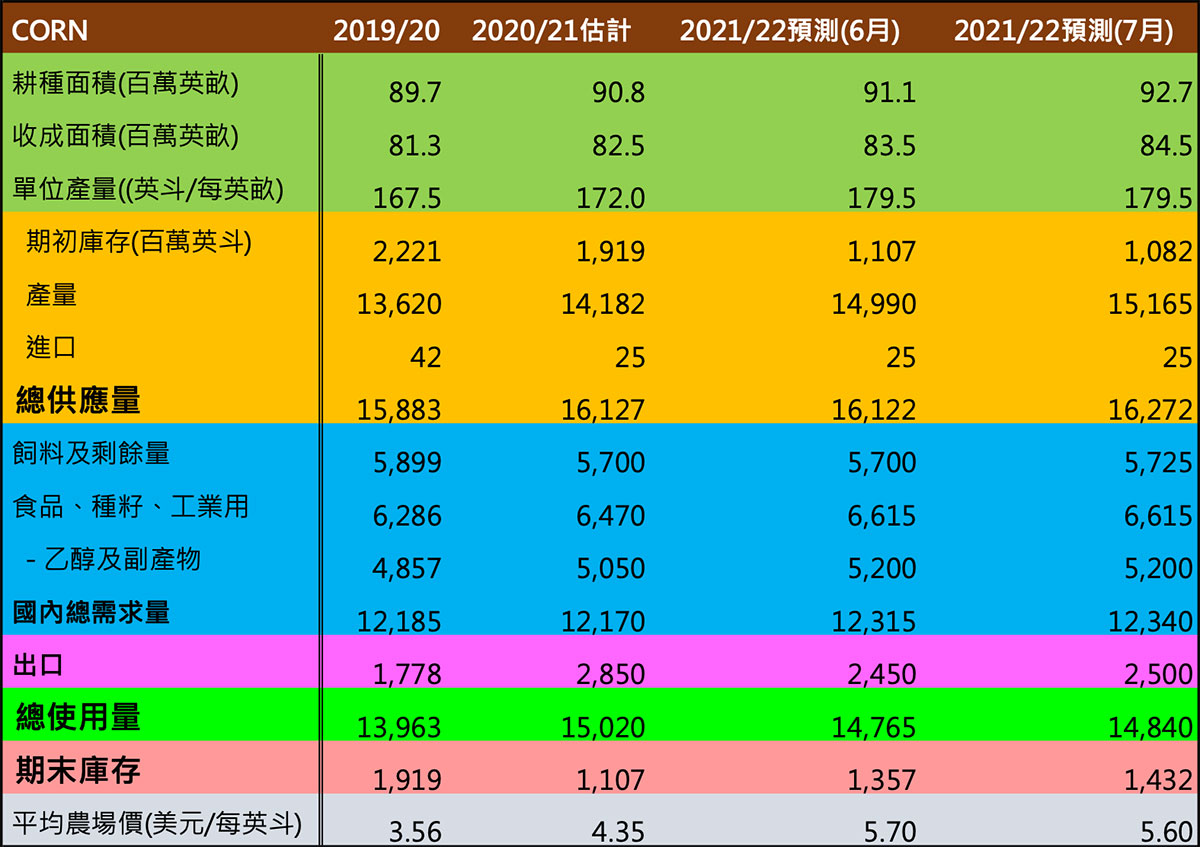 美國農業部公布7月份的供需報告,根據6月30日的季末庫存報告所示,因2020/21年在飼料使用增加,故2021/2022年的玉米期初庫存減少了2500萬英斗。而6月30日的耕種面積報告增加,因此預計2021/22年玉米產量將提高1.75億英斗。美國新穀玉米平均單位面積產量不變,為每英畝179.5英斗。