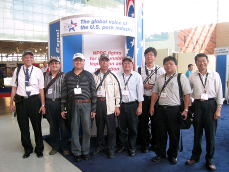 於6月8日參觀全球養豬大展(World Pork Expo),圖左起,台灣糖業股份有限公司畜殖事業部副執行長王北林、台灣卜鋒企業股份有限公司協理蔡適聰、行政院農業委員會畜牧處處長許桂森、大成長城企業股份有限公司副總經理曾添福、財團法人台灣動物科技研究所動物醫學組研究員兼組長陳世平、行政院農業委員會動植物防疫檢疫局動物防疫組科長楊文淵、財團法人中央畜產會家畜組組員林正祥、美國穀物協會駐台代表張學義。