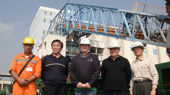 於1月20日在高雄港第72號碼頭登船參觀玉米卸貨的實況。圖左起,船上的安全官,東森國際股份有限公司卸貨組長李永順,美國穀物協會美國總部全球貿易經理柯德樂先生,美國密蘇里州玉米銷售協會理事長波特先生,和美國穀物協會駐臺代表張學義。