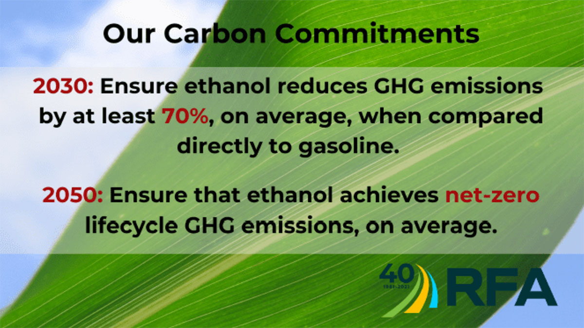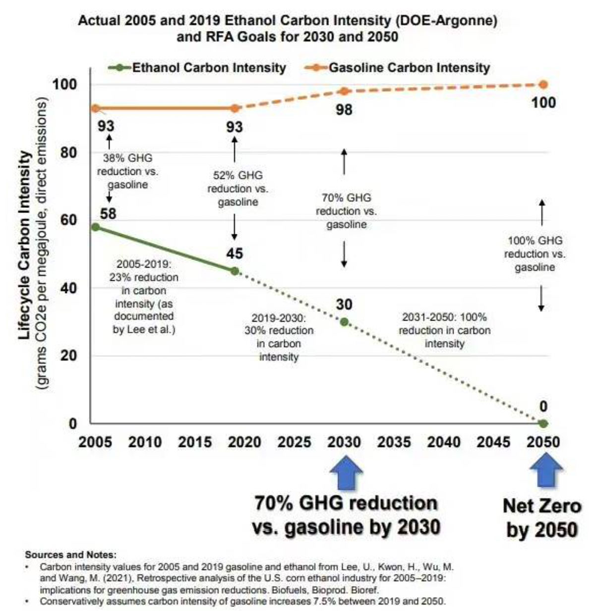 美國可再生燃料協會提出:「今天的玉米乙醇已經是一種低碳燃料,有助於清潔交通運輸燃料,美國能源部阿貢國家實驗室最近的一項研究報告表明,與汽油相比玉米乙醇可以減少52%的溫室氣體排放。」「如果有更好的激勵政策措施,乙醇可以做得更多。它可以作為輕型汽車和卡車更經濟實惠的零排放燃料,同時還有助於中型和重型車輛、航空、船舶和固定發電的脫碳。」